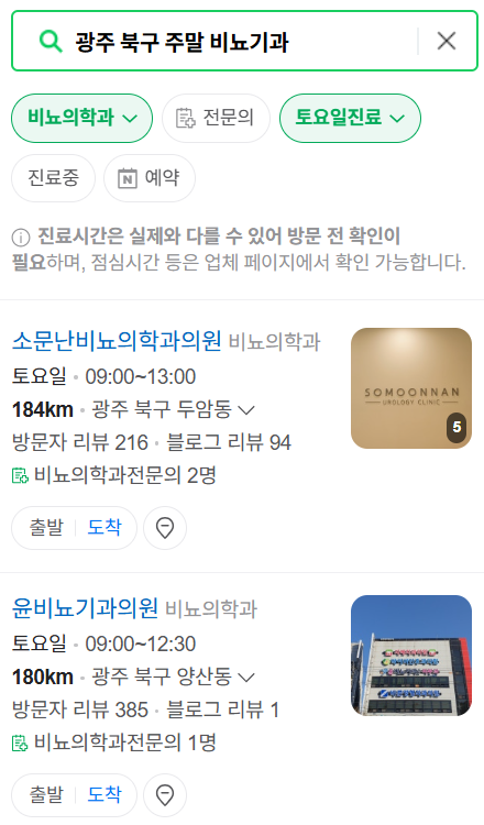 네이버 지도 검색: 네이버 지도 앱에서 '광주 일요일 비뇨기과', '광주 공휴일 비뇨기과'으로 검색하면, 실시간으로 운영 중인 병원을 찾을 수 있습니다.