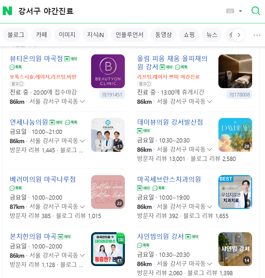 | 피부/비만 | 뷰티온의원, 베러미의원, 샤인비의원 | 마곡동 | ~20:00~20:30 |
