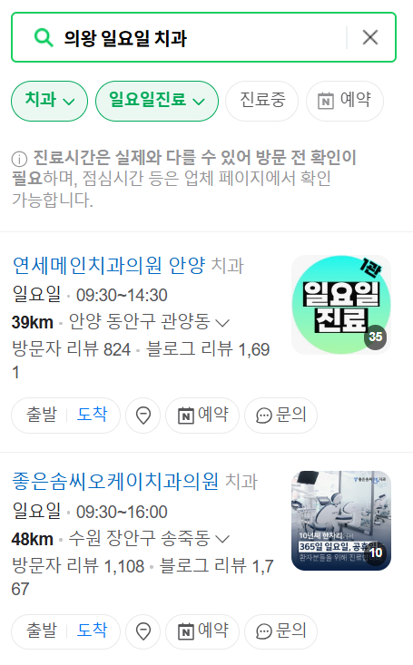 네이버 지도 검색: 네이버 지도 앱에서 '의왕 일요일 치과', '의왕 공휴일 치과'으로 검색하면, 실시간으로 운영 중인 병원을 찾을 수 있습니다.