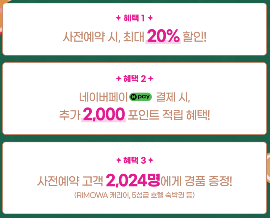 - 사전예약 고객 중 2,024명을 추첨해 RIMOWA 캐리어, 5성급 호텔 숙박권 등 푸짐한 경품 제공.
