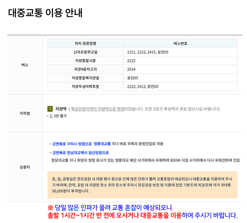 🚗 뚝섬한강공원 내 주차장이 매우 협소하여 반드시 대중교통을 이용해 주세요.